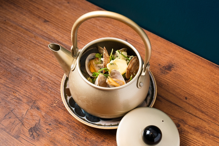やかんに入ったアサリの酒蒸しは、お酒のお供にもぴったりなおつまみメニューです。