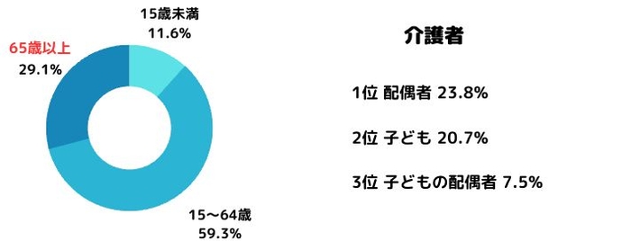 内閣府が発表した令和4年版高齢社会白書によれば、2022年9月時点で65歳以上の高齢者の割合は29.1%となり、2036年には33.3%にまで増加するとされています。平均寿命の長い日本で高齢化が進むことは介護需要の上昇に繋がりますが、同居する家族が主たる介護者になるケースが多いのが実態です。最も多いのは配偶者、次に子ども、子どもの配偶者と続きます。