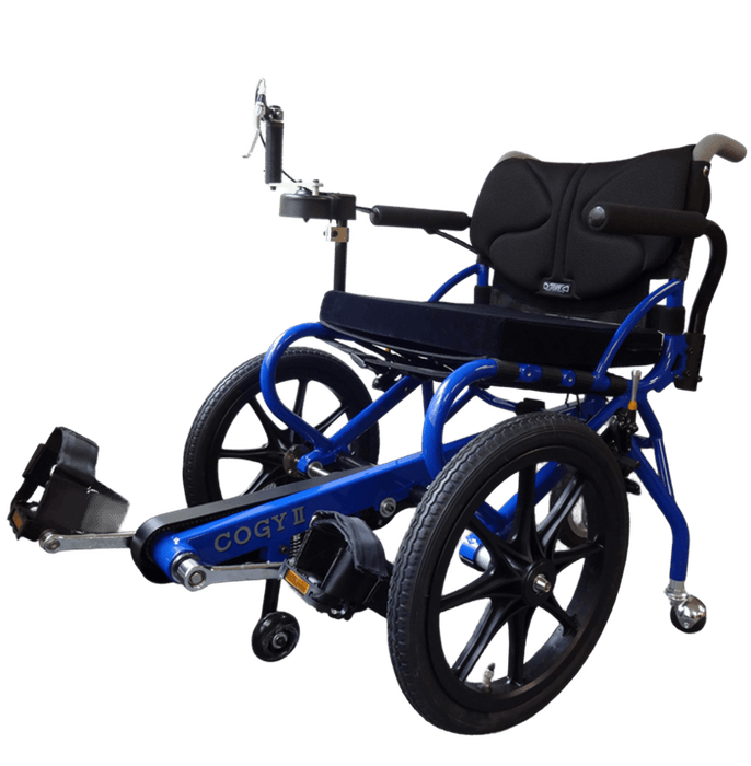 歩行が難しい方でも、どちらかの足が少しでも動かせれば、歩行反射が働き、もう一方の足が動いて自分の両足でペダルをこぐことができる、自転車のようにペダルがついた足こぎ車いすです。