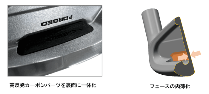 軽量かつ高反発なカーボンパーツをフェース裏面に一体化し、低重心化とフェースの薄肉化を実現。優れた反発性と低重心化による高い打ち出し角により、飛距離性能がアップ。8番アイアンで7番アイアンのような飛距離を実現します。