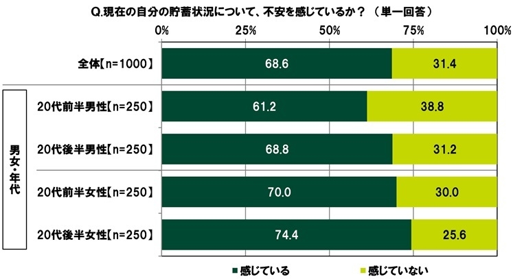 現在の自分の貯蓄状況について、不安を感じているか聞いたところ、「感じている」は68.6%、「感じていない」は31.4%と、20代の3人に2人が自身の貯蓄状況に対し不安感を抱いていることがわかりました。