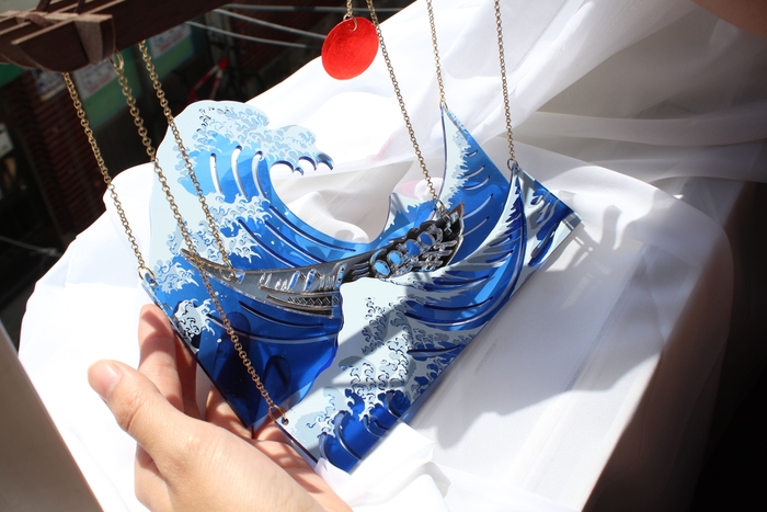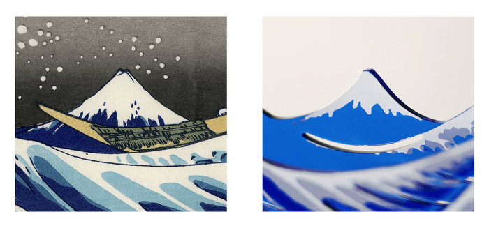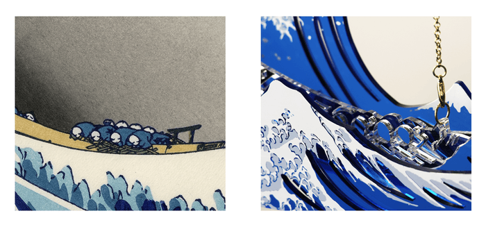 今回の商品「北斎サンキャッチャー」は、木版を利用して繊細に表現した原作の版画をレーザーカット(Laser Cut)でアクリルを繊細に切り落とし、その上にシルク印刷(Silk Print)で作品のディテールを表現することで現代的な工法で表現しました。