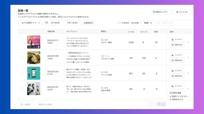 株式会社ミショナが提供するInstagram(インスタ)自動化ツール「エルグラム」では投稿済み画像・動画のキャプション・いいね・コメント・保存・シェア・リーチ・エンゲージメントの確認と分析ができます。