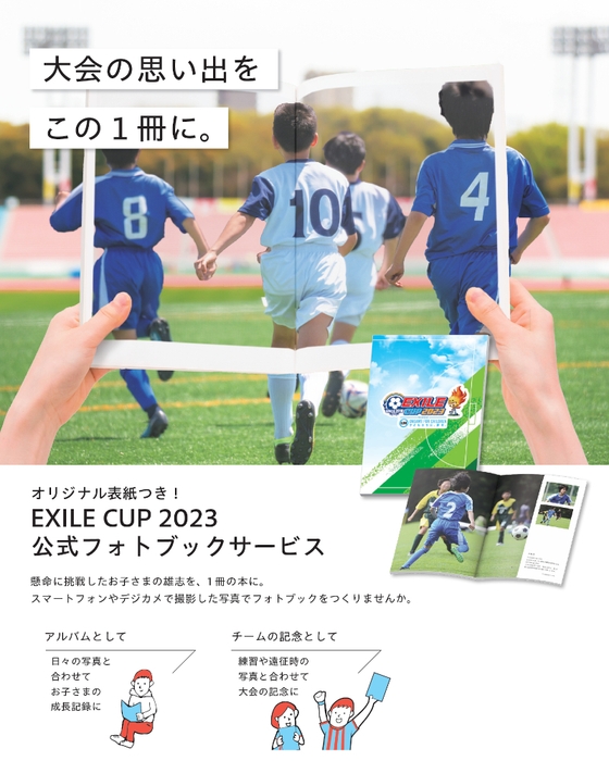 また、当社では今回の大会に合わせ「EXILE CUP 2023公式フォトブックサービス」の提供を7月2日より開始いたします。本大会用にご用意したオリジナル表紙を使用したカスタムフォトブックが作成できるサービスで、大会参加の記念やお子さまの成長記録として、ぜひご利用下さい。