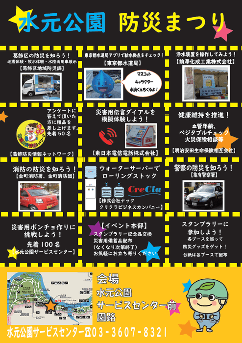 協力団体(順不同):葛飾区地域防災課、葛飾防災情報ネットワーク、亀有警察署、金町消防団、金町消防署、東京都水道局、前澤化成工業株式会社、東日本電信電話株式会社、明治安田生命保険相互会社、一般財団法人日本気象協会、日本製紙クレシア株式会社、FDK株式会社、株式会社 明治、コールマン、クリクラ
