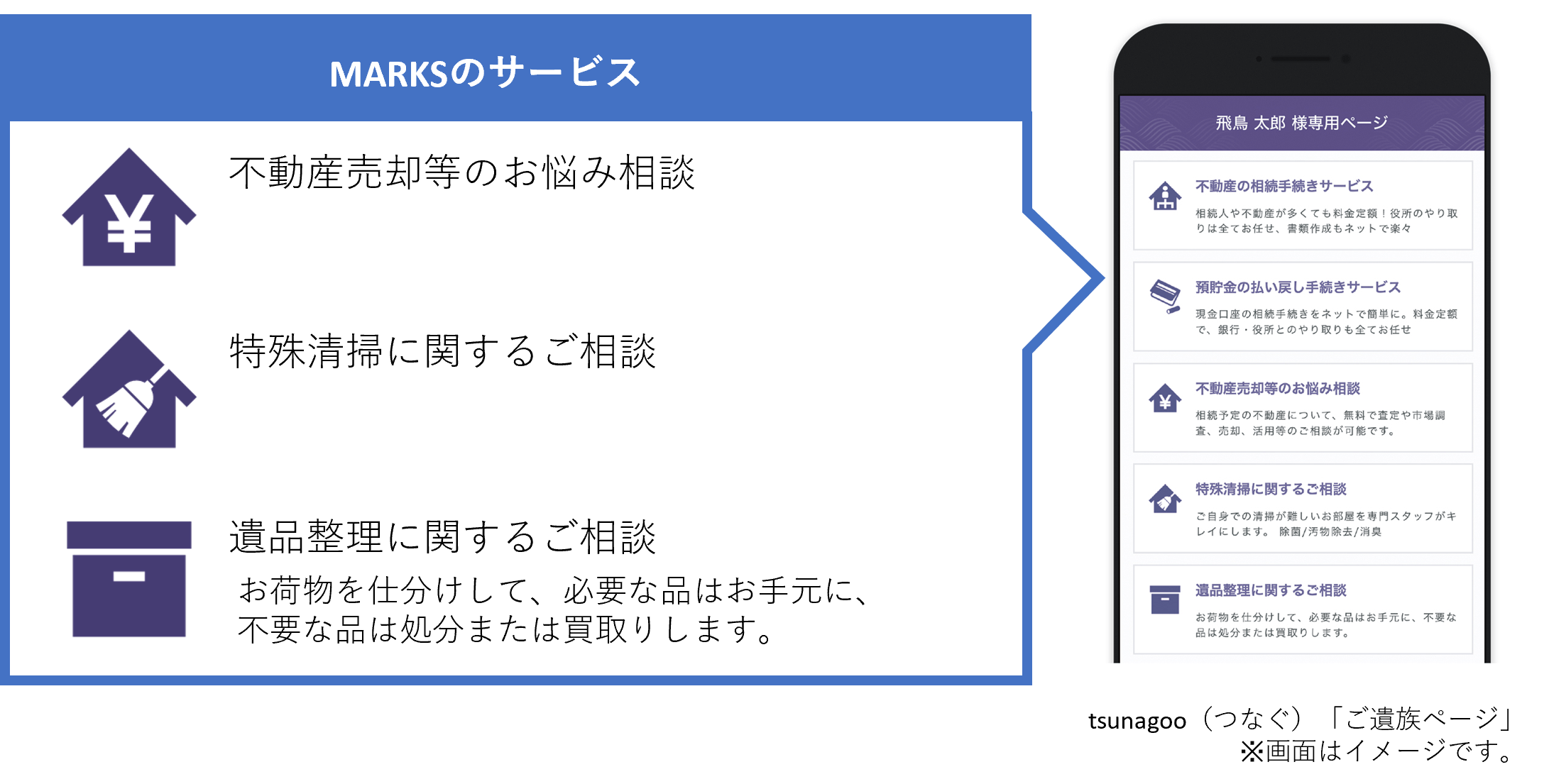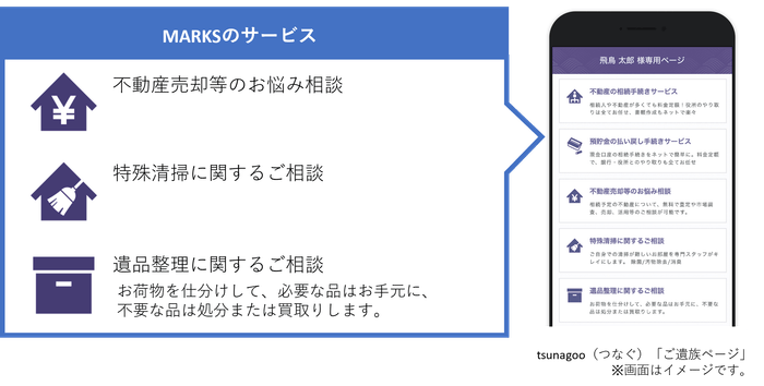 今回の業務提携により、「tsunagoo(つなぐ)」サービスに相続不動産、遺品整理、特殊清掃の相談窓口を新設し、受けた相談に対してMARKSが対応を行います。これにより訃報連絡から相続不動産の売却相談までをワンストップで手続きすることが可能になり、葬儀後のご遺族の負担軽減や困りごとに対し素早く対応できるようになります。