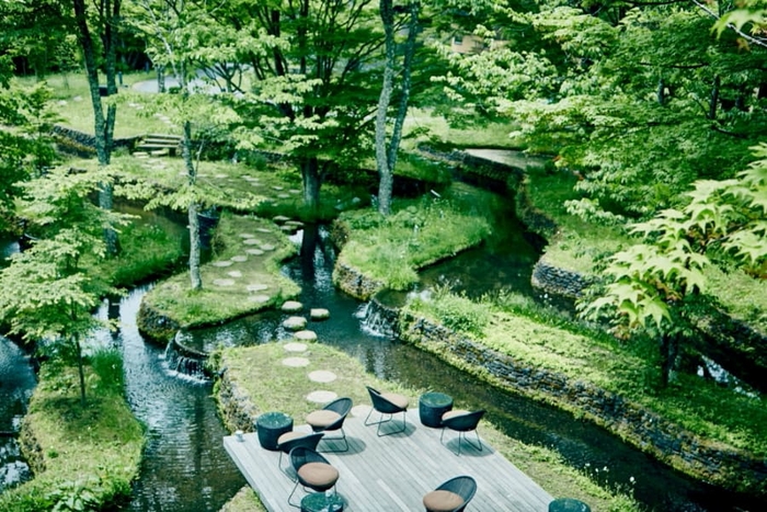 谷の集落に滞在する。離れの客室は水辺を囲み、部屋のテラスからは季節のうつろいが感じられます。軽井沢野鳥の森に面した豊かな自然環境にて、休息の時間を満喫できる宿泊施設です。