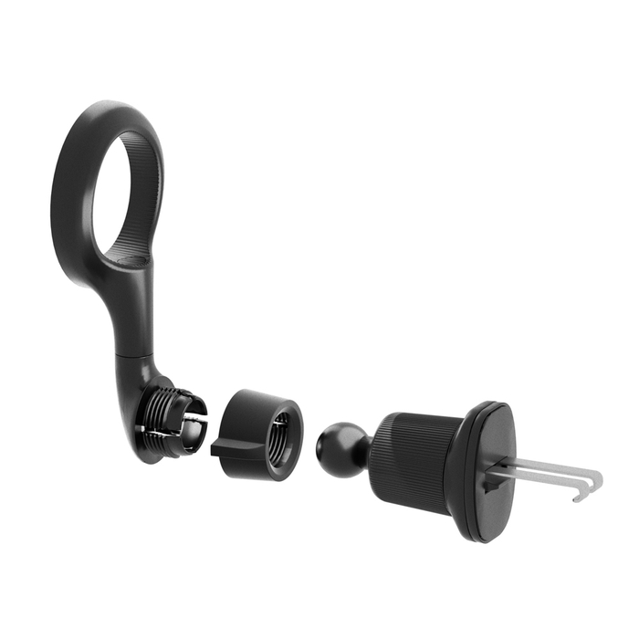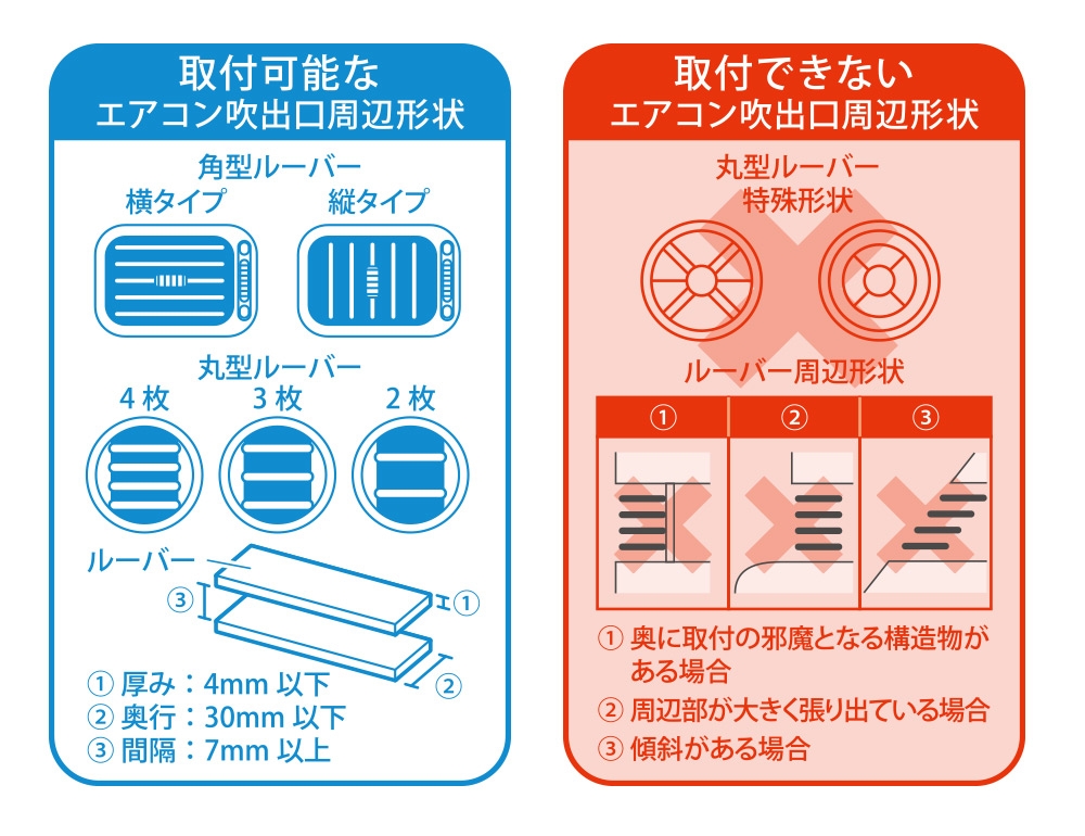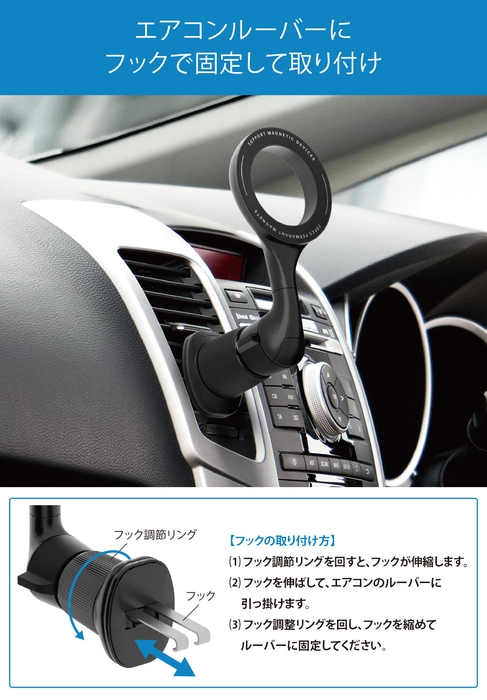 ホルダーの固定方法は、車のエアコン吹き出し口(ルーバー)に引っ掛けて固定するフックタイプです。アーム部はエアコン吹き出し口の風の流れを塞がないように設計されております。