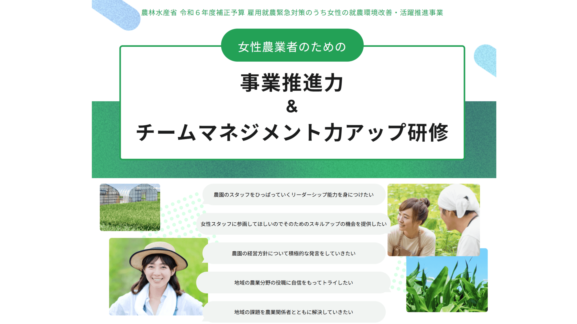 女性リーダー・経営者の育成をサポートする 「女性農業者のための事業推進力&チームマネジメント力 アップ研修」受講生の募集を開始いたしました!