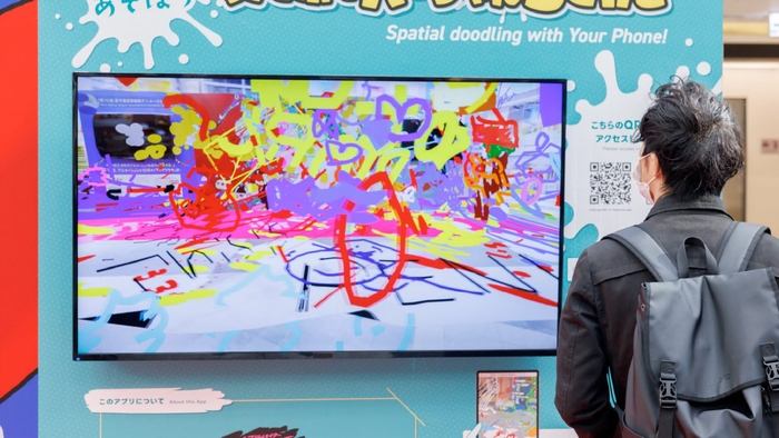 作家・トーチカが空間にアニメーションを共同制作するツールとして開発中のウェブアプリです。スマホやタブレットPCでの描画に適しており、複数人で空間に落書きをすることができます。2023年に続いての展示で、スティッキーボード(付箋)を貼る機能と描いた場所から離れると薄くなって消えるホログラム機能が追加されています。ぜひお楽しみください!