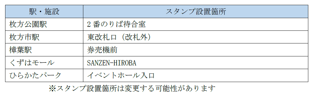 【ラリーポイント】枚方公園、枚方市、樟葉の各駅とくずはモール内SANZEN-HIROBAおよびひらかたパークイベントホール入口の計5カ所