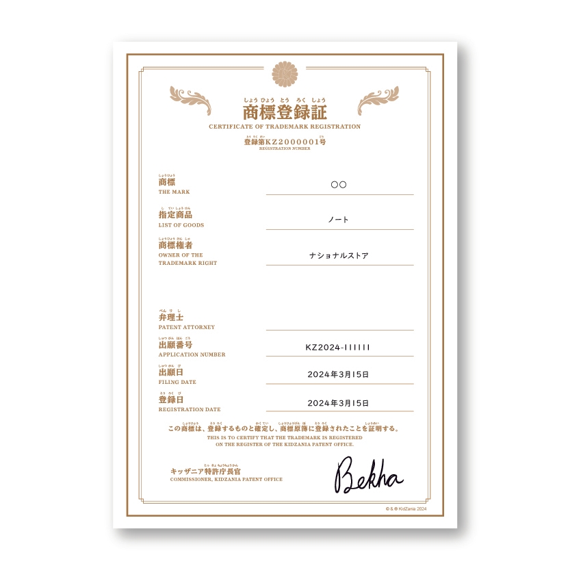 「弁理士事務所」パビリオンでこども達は「弁理士」として、弁理士の役割や商標について学んだ後、商標出願をする「商標登録」に関わる過程を体験します。こども達は、施設内にある「ナショナルストア」(お土産ショップ)や「ミルクハウス」パビリオン(乳製品を使った新商品を開発するパビリオン)から依頼を受けるというリアルな設定(※)のもと、代理人として商標登録出願書類を作成し、キッザニア特許庁へ提出。その後、キッザニア特許庁で商標登録証を受け取ります。