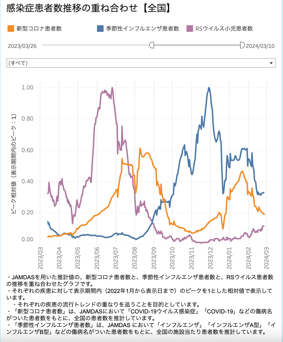 年間を通した感染対策の必要性の根拠として、直近1年間の「新型コロナ患者数」、「季節性インフルエンザ患者数」「RSウイルス小児患者数」の感染症患者数推移の重ね合わせ(全国)のグラフを紹介。