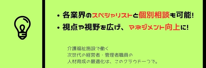 さらに、同じ悩みを持つ後継者のコミュニティを活用することで独自のコミュニティが結成されます。新施設長の早期育成、タレントマネジメント管理にも貢献します。