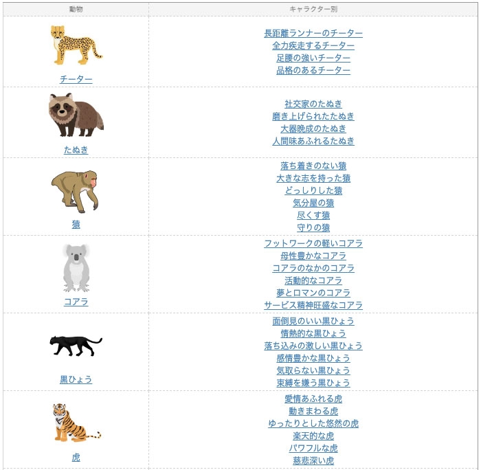 生年月日を入力して実行することで、すぐに自動計算により全144パターンから該当の動物キャラの診断結果ページへと遷移します。