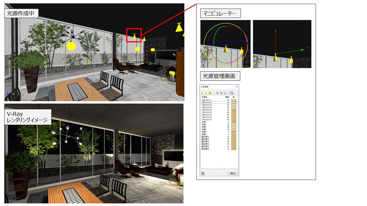 リニューアルした「光源管理」は、光源を作成、編集するアイコンが一つに。作成方法は資材選択モード(要素認識)と点ヒット(自動点認識)の2種類あります。移動・回転は画面に表示されるマニピュレータで思いのまま操作。強度もスライドバーで色はカラーパレットから選択できるので多彩な表現が可能。強度もスライドバーで微調整することができます。これらをパースで確認しながら調整できるので、照明を入れた図面作成がよりしやすくなります。照明はおしゃれな外構、雰囲気の演出をデザインするうえで欠かせないアイテムとなっています。