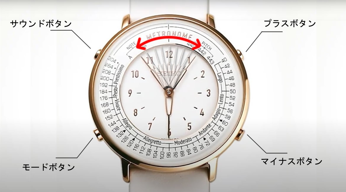 モードボタンを2回押し、基準音機能を選択。プラス(マイナス)ボタンを押して希望の基準音を設定。(時針が音名「AまたはB♭」を、分針が基準ピッチ「440、442、443hz」を示します。)サウンドボタンを押すことで基準音を鳴らすことが出来ます。