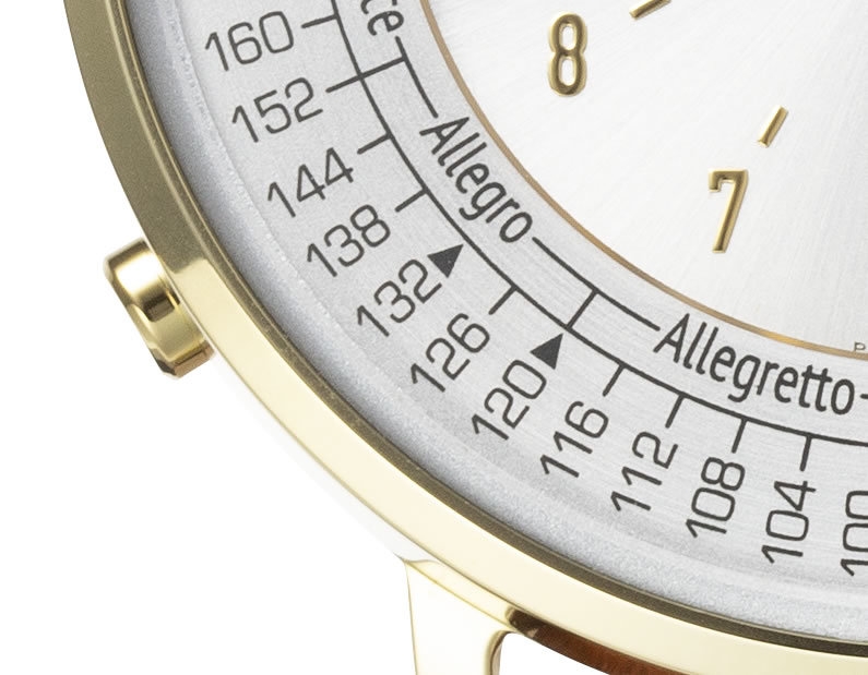 メトロノーム機能は、メトロノームモードから任意のテンポを設定するだけで、時計の分針がリズミカルにダイヤルの上を左右に往復し、ピッピッという電子音とともに視覚的にテンポを確認することができます。テンポは、40~304(BPM)までの41ステップが用意されており、小さいながらも実用的な仕様となっています。