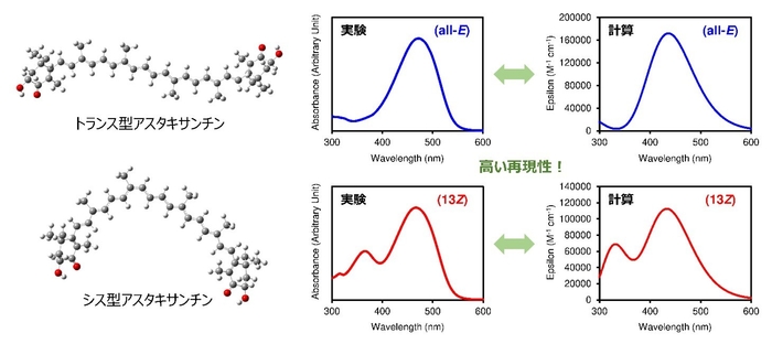 商業的に重要な3種類のカロテノイド(リコピン、β-カロチン、アスタキサンチン)のトランス型および主要なシス型(9シス型、13シス型など)異性体について、量子化学計算によりスペクトルデータ(吸収スペクトル、光吸収強度)を取得し、それらの計算結果からHPLC強度補正係数を求めました。量子化学計算は、Gaussian プログラム(※12)での時間依存密度汎関数理論(TD-DFT)(※13)を用いて行われました。