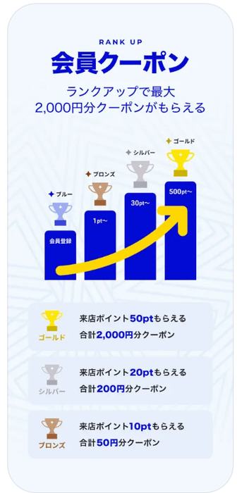 ランクに応じて、来店時に付与されるポイントがアップします。来店するほど、さらにお得に!