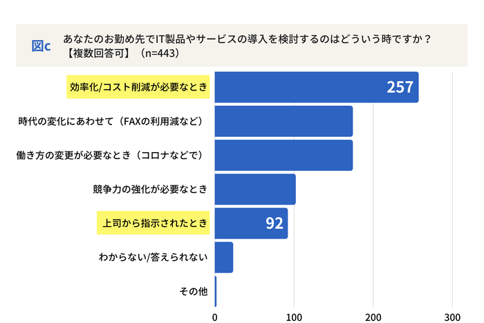 それでは、IT製品やサービスを導入検討する具体的なきっかけはどのような時でしょうか。アンケートの結果をみると、第1位は「効率化・コスト削減が必要なとき」となり、「上司から指示されたとき」の2倍超となりました。