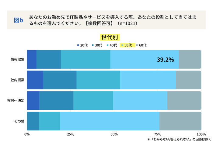 まず「サービスを導入する際、どのような役割を担っているか」と質問したところ、具体的な回答があったのは全体の回答のうち57.2%でした。その中で、第1位の回答は「情報収集」。多くの製品が類似の機能や特徴を持つ場合、まずはどの製品を社内で検討するか、情報収集を経て選択肢を絞るプロセスが重要となります。そのためか、この「情報収集」の段階には50代が関わっている割合が多く、業務の経験値をもとに自社によりフィットした製品やサービスを選ぶに欠かせない世代と示唆する結果となりました。