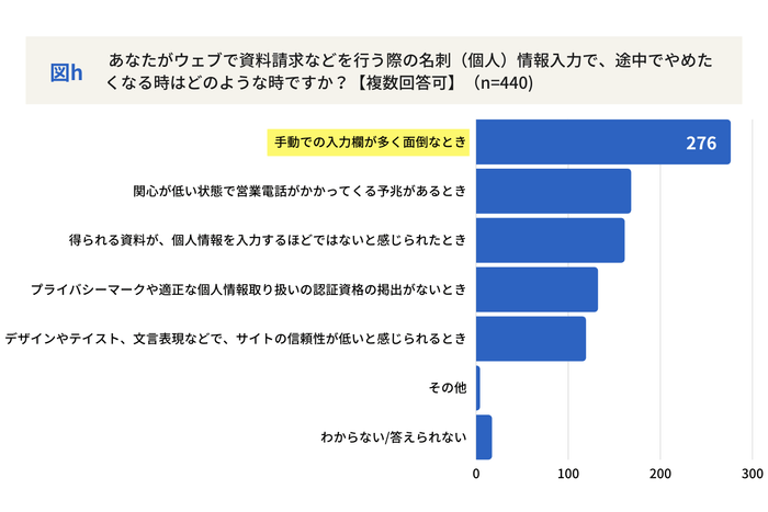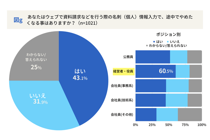 次に比較・検討ではより詳しい情報や料金を求める際に、問合せ窓口や資料請求を行うことがあります。「問合せに必要な情報を入力するのは少し面倒くさいな」と感じたことがある方もいるかもしれません。今回「ウェブなど資料請求などを行う際の名刺情報入力で、途中でやめたくなる事はありますか?」と尋ねたところ、「はい」43.1%、「いいえ」31.9%となり、理由の第1位として「手動での入力欄が多く面倒なとき」に票が集まりました。ポジション別に見ると特にこの傾向が強いのが、「経営者・役員層」で約6割が「はい」と回答し、時間の制約があり、業務に専念するために効率的なプロセスを求める傾向がより高いことが分かりました。