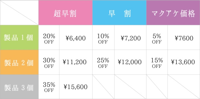 ◆早割・・・製品1個 ¥7,200 製品2個 ¥12,000