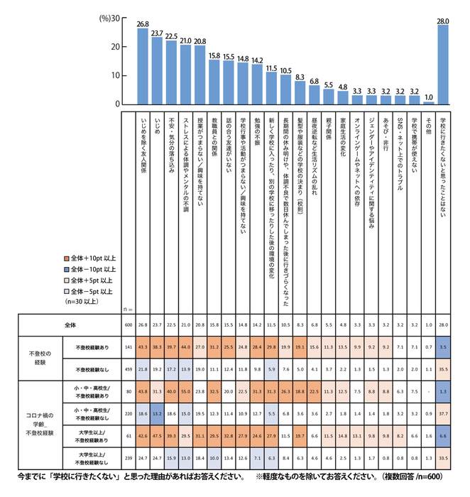 一方、大学生以上/不登校経験ありは「いじめ」「いじめを除く友人関係」「不安・気分の落ち込み」の順になっており、小・中・高校生との違いが見て取れます。