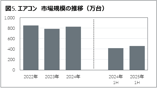 下半期については、前年の規模をやや下回るものと見ている。Windows10サポート終了後のパソコンの需要の落ち着き、6月に前倒しされたエアコンの需要の反動減が影響するとみられる。ただし、上半期の好調が通年の小売市場規模を下支えし、2025年の家電小売市場規模としては前年をわずかに上回る水準で着地する見通しだ。