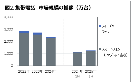 携帯電話市場は前年比10%増の1,250万台となった(図2)。そのうち97%を占めるスマートフォン(ファブレット含む)は同11%増の1,210万台、フィーチャーフォンは同12%減の40万台となった。税抜き販売端末価格は前年から4%上昇の92,000円となった。