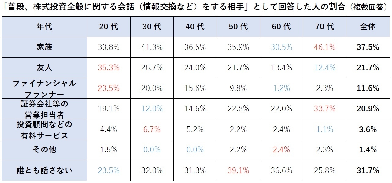 株式投資について普段、情報交換などの会話をする相手についても質問しました。その結果、若い世代ほど数値が高くなる傾向にあったのは「友人」と、意外にも「ファイナンシャルプランナー」でした。