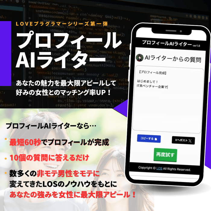 株式会社GOEN(本社:大阪府交野市、代表:西中 亮太)と株式会社プランメンタル ライフジャンプのメンタリストYuZuKiが共同運営する、高学歴理系男性対象の誠実な恋愛スクール「恋愛最適化予備校~Love Optimize School~(通称LOS)は、LOVEプログラマーシリーズ第一弾、業界初(※1)のAI自動プロフィール文代筆サービス「AIプロフィールライター」を2024年11月14日(木)よりリリースいたしました。