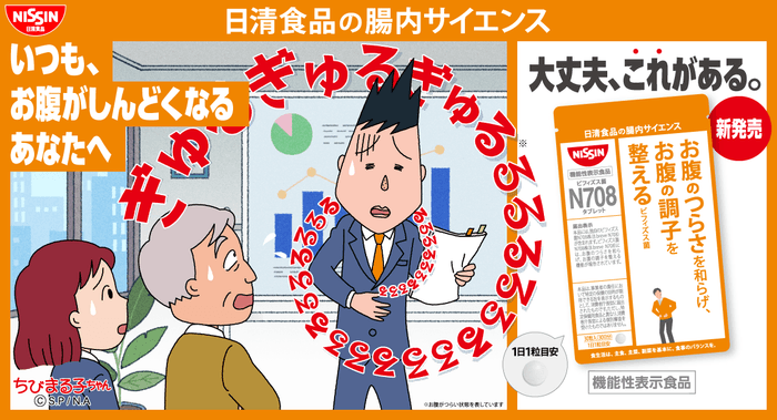 日本アニメーション株式会社(本社:東京都中央区、代表取締役社長:石川和子)がアニメーション制作・ライセンス管理を行う「ちびまる子ちゃん」に登場するキャラクター「山根つよし」が、日清食品株式会社(本社:東京都新宿区、代表取締役社長:安藤徳隆)が販売する「ビフィズス菌 N708 タブレット」のキャンペーンキャラクターに起用されました。