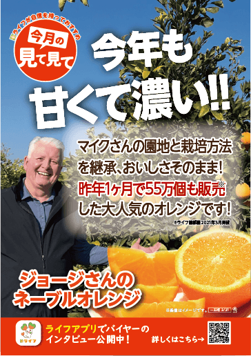ライフが自信を持っておすすめする「今月の見て見て」の3月商品に選ばれた「ジョージさんのネーブルオレンジ」。毎年この時期に販売し大好評をいただいた「マイクおじさんのネーブルオレンジ」の園地と栽培方法をジョージさんが継承し、おいしさはそのまま甘くて濃いネーブルオレンジに育てました。