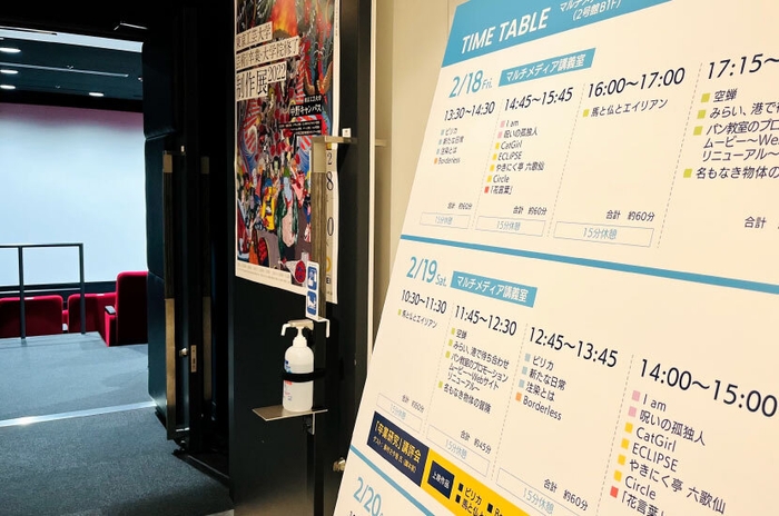 映像学科及び映像メディア領域では、1号館1階「ゼミ演習室1・2」と2号館地下1階のシアター施設「マルチメディア講義室」で、短編映画やドキュメンタリー、CGを用いたショートムービーなどが上映され、鑑賞することができます。