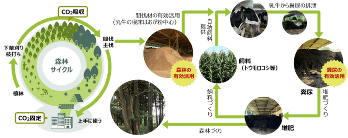 ホウライは、130年以上の歴史を持つ那須千本松牧場において、従来から行っている自社畑の牧草・デントコーンを餌とする乳牛育成、牛の排泄物のたい肥化、6次産業化、森林活用などの取り組みをさらに高度化することで、環境負荷削減と「環境にやさしい牧場づくり」を推進しています。その循環サイクルによって生まれる資源を有効活用し、次世代へと繋がるサステナブルな「環境適応型企業」として、SDGsへのさらなる貢献を目指しています。
