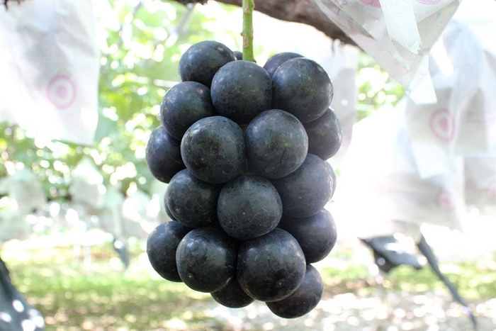 「ナガノパープル」は、長野県オリジナル品種のぶどうで、長野県以外ではほとんど栽培されていません。「巨峰」と「リザマート」を交配して育成された品種で、見た目は巨峰に似ていますが、粒は大きく墨のような濃い紫色をしています。また、黒系のぶどうとしては珍しく、種無しで食べることができる高級黒系ぶどうです。酸味は少なく、濃厚な甘味とさっぱりとした後味が特徴で、果汁が手に付くことも少なく、スナック感覚でパクパクと食べることができるので女性にも大人気です。