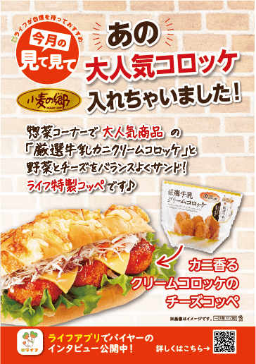 “おいしい” “ワクワク” “ハッピー” をお届けするライフコーポレーションは、11月1日(月)に「カニ香るクリームコロッケのチーズコッペ」を首都圏の“小麦の郷”がある店舗で新発売いたしました。