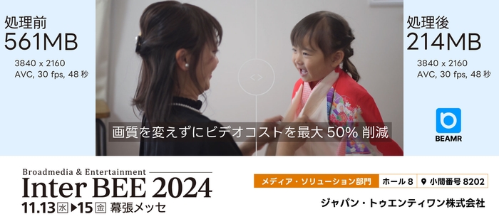 ジャパン・トゥエンティワン株式会社(本社:愛知県豊橋市、以下:J21)は、2024年11月13日(水)~15日(金)に幕張メッセにて開催される「Inter BEE 2024」に出展し、ビーマー社(Beamr Imaging, LTD.、NASDAQ:BMR、本社:イスラエル)のビデオ軽量化サービス「Beamrビデオクラウドサービス」(以下:Beamrクラウド)の各種機能のデモを実施いたします。