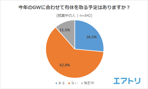 現在就業中の人に、今年の GW に合わせて有休を取る予定があるかを聞いたところ、予定が「ある」と回答した人が 26.5%に対し、「ない」と回答した人は 62.0%となりました。また「検討中」の人は 11.5%でした。