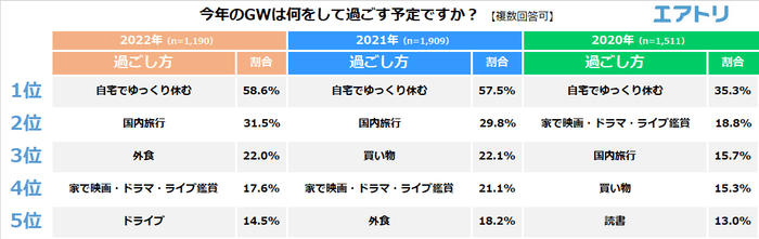 GW の予定 2 位「国内旅行」3 位「外食」の外出予定をおさえ 3 年連続で 1 位は「自宅でゆっくり休む」! 県民割・ブロック割は GW に利用できない上に“わかりにくい”!?