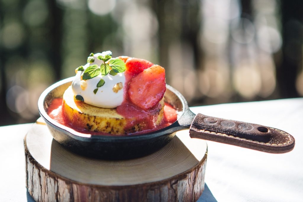 ウェルカムスイーツとして、旬のフルーツとともに、スキレットで仕上げたバウムクーヘンを提供しています。果実の粒感を楽しめる温かい苺のソースをあしらった一品です。甘いバウムクーヘンに、程よい酸味の苺を合わせることで、苺の味わい深さを堪能できます。