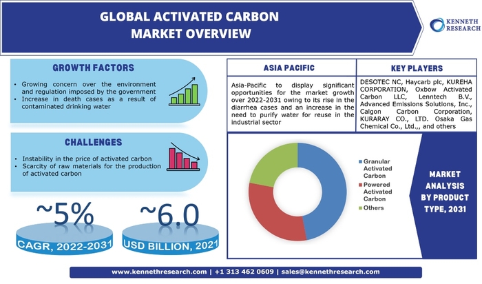 世界の活性炭市場の成長は、2022年から2031年の間に約5%のCAGRによって政府によって課された環境および規制に関連する懸念の高まりによって推進される