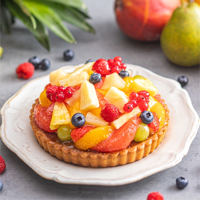 バター香るサクッと香ばしいアーモンドのタルトにいちご、オレンジ、グレープフルーツ、ぶどう、マンゴー、パインアップル、フランボワーズなどの10種のフルーツを彩り良く飾りました。