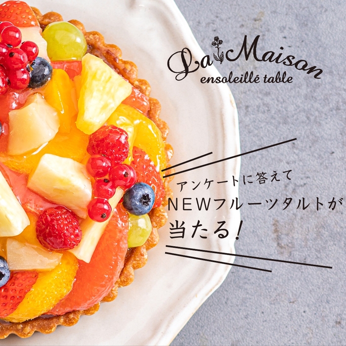 フルーツタルトのリニューアルに合わせて、ラ・メゾンオンラインショップのより良いショップ作りのため、皆様のご意見・ご感想をお聞かせいただきたく、アンケートキャンペーンを実施することとなりました。