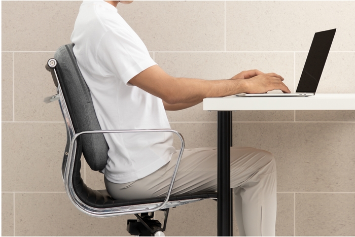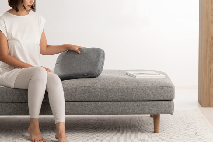 KATA-MOMYは椅子の背もたれとの間に挟んで、背中や腰のほぐしクッションとしても使えます。アッシュグレーのファブリックに包まれたシンプルなデザインが、テレワーク中のデスクシーンやオフタイムのリビングや寝室にもなじみ、疲れやコリをいつでもケアできます。また就寝前に肩甲骨まわりをほぐせば心地よい眠りにつけるようになり、快眠アイテムとしても役立ちます。