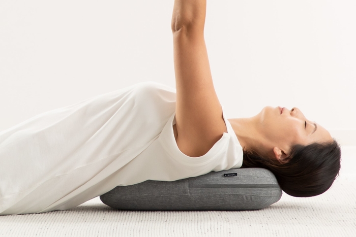 KATA-MOMYの上に寝転がると、胸が左右に大きく開いて気持ちがリラックスします。この状態で両腕をゆっくりと真上に上げたり、頭の後ろまで伸ばしたり、左右に広げていくことで、コリ固まった肩甲骨まわりの筋肉をストレッチできます。また、背中全体を後ろに反らすことで、猫背姿勢が本来のS字カーブへと導かれ、丸まった姿勢のゆがみ補整も期待できます。