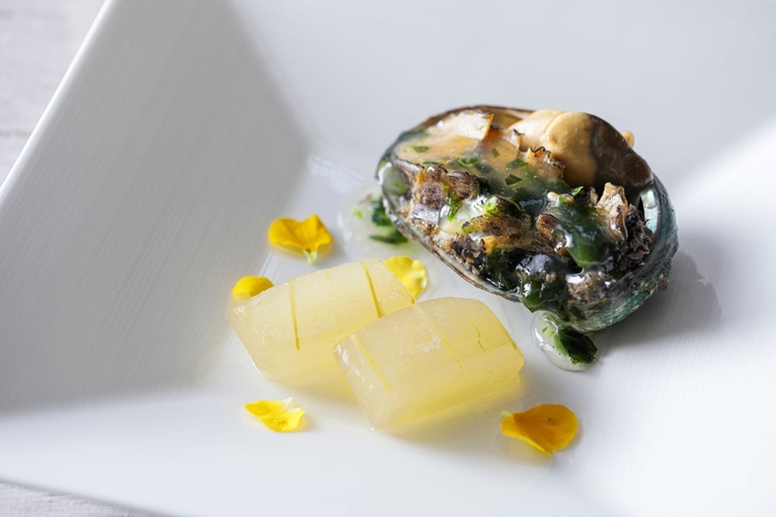 ・魚料理:奥尻産蝦夷鮑のソテー 日高産若芽と柚子の銀餡ソース