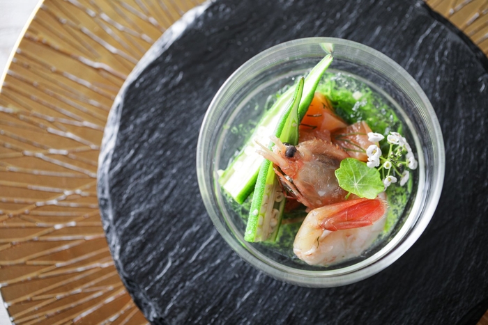 ・冷前菜:北海道産鮭と函館産牡丹海老のマリネ 北斗産胡瓜のクーリ 山葵のジュレアクセント